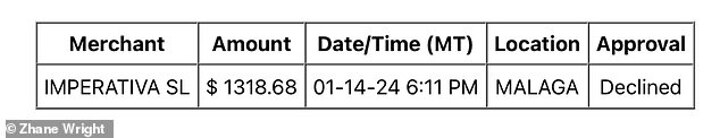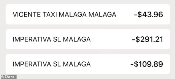 Zhane stayed at the hotel and fell asleep. She woke at 2am and spotted a 'fraudulent activity' email in her inbox which said there had been a failed attempt to withdraw $1,318.68 from her Bank of America platinum credit card in Malaga.