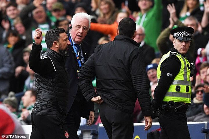 Derek McInnes had been looking to lead Aberdeen into his fifth final as boss but both he and his assistant manager Tony Docherty finished the game watching from the stands as they also lost their discipline on the touchline in the face of a green and white onslaught.