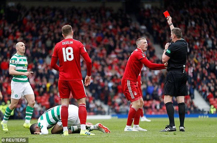 But within seconds the game took a major swing in Celtic's favour as Ball got his marching orders. Already on a booking for a trip on Forrest, he was shown a second after his head cracked against the cheek of his former Pittodrie team-mate Christie in a sickening collision.