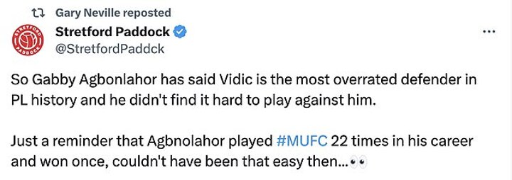 It said: 'So Gabby Agbonlahor has said Vidic is the most overrated defender in PL history and he didn't find it hard to play against him. Just a reminder that Agbonlahor played #MUFC 22 times in his career and won once, couldn't have been that easy then...'