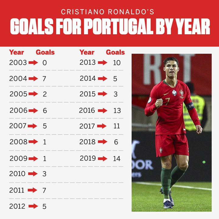 Here's Cristiano Ronaldo's road to his 99 international goals year by year.