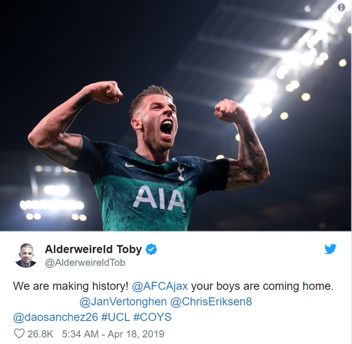 Toby Alderweireld has told Ajax that their 'boys are coming home' after Tottenham's dramatic Champions League quarter-final victory over Manchester City set up a semi-final clash with the Dutch giants.
