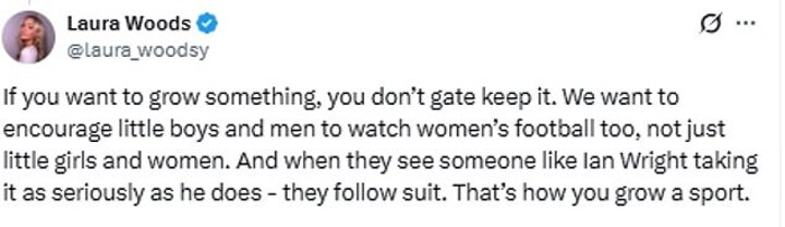 Earlier on Monday, ITV presenter Laura Woods took to X to tell Aluko that her 'gatekept' comments were 'dragging women's punditry backwards'.