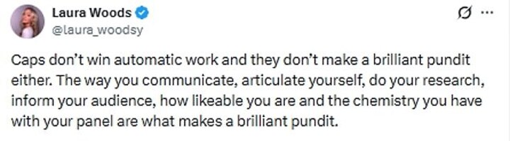 'Caps don't win automatic work and they don't make a brilliant pundit either,' Woods wrote. 'The way you communicate, articulate yourself, do your research, inform your audience, how likeable you are and the chemistry you have with your panel are what makes a brilliant pundit.