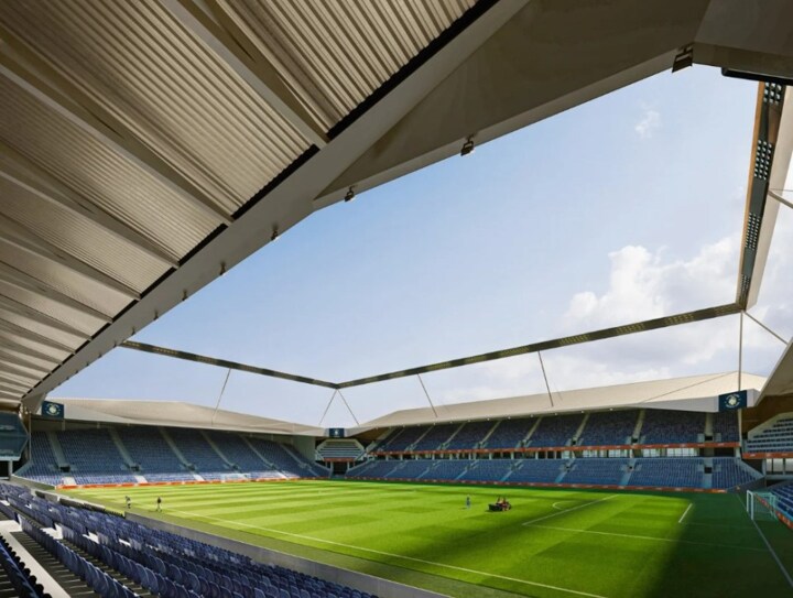 Most striking is the floodlight above the stadium roof that covers the entire perimeter, shining down on the pitch from every angle.
