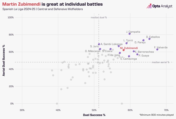 And when it comes to that more physical side of the game, Zubimendi tends to acquit himself well. The graphic below shows how he had a solid record in both ground duels and aerials in 2024-25, and that’s been a feature throughout his career in senior football.