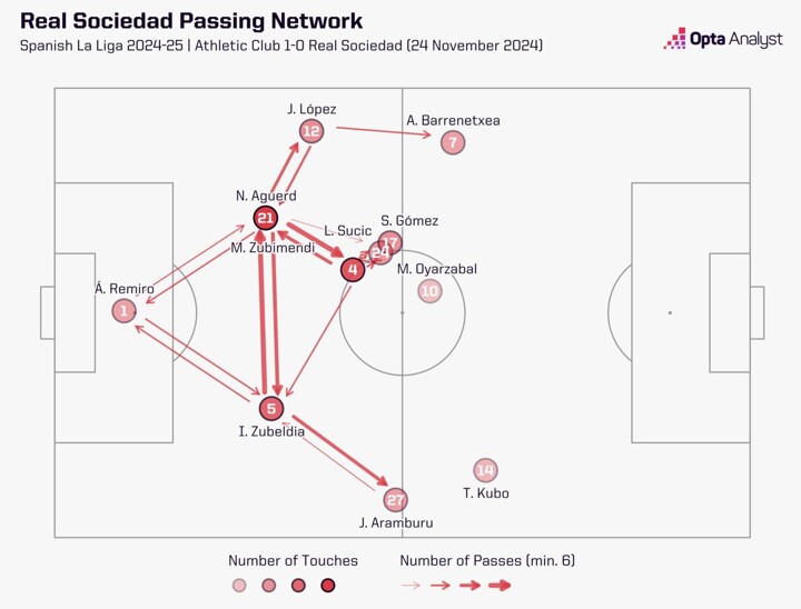 The passing network below for La Real’s November defeat to Athletic Club is a good example, with that the game in which he registered his most touches and passes last season.