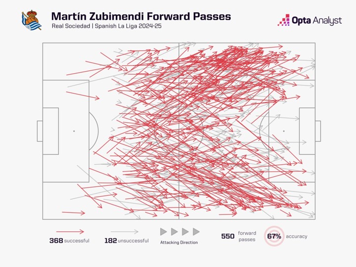 And, considering his reduced influence in attack, Zubimendi’s 29 passes breaking the opposition’s defensive line was notably only bettered by two nominal central/defensive midfielders.