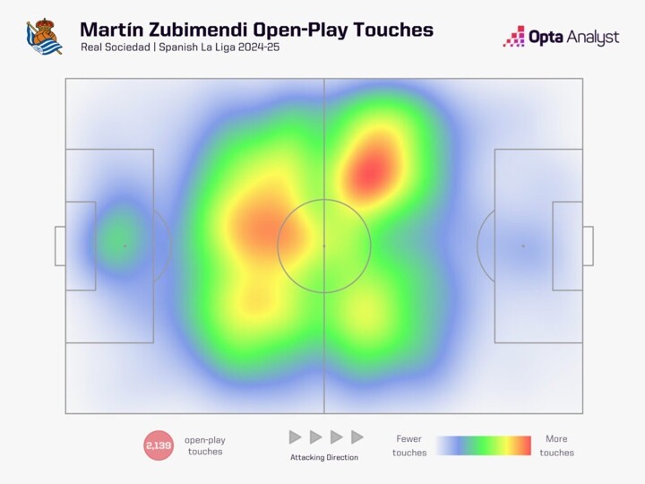 It’s also worth bearing in mind here that Real Sociedad aren’t obsessed with possession. Their 53.4% share in 2024-25 wasn’t a particularly outrageous figure, and yet over the course of the season, Zubimendi was more acquainted with the ball than most.