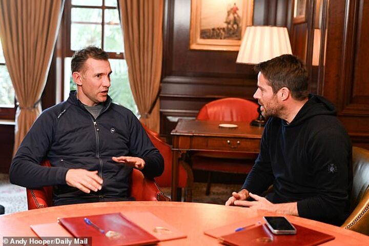 Shevchenko is sitting in a library near Ottershaw, Surrey. He's speaking with his friend of 15 years, Sportsmail's Jamie Redknapp, who asks how he's explained the situation to his four boys, Jordan, 17, Kristian, 15, nine-year-old Alexander and seven-year-old Ryder.