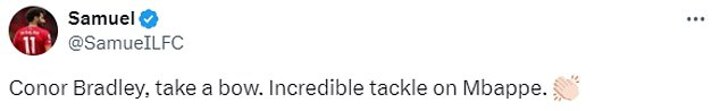 'Conor Bradley, take a bow,' on fan posted on X, formerly Twitter. 'Incredible tackle on Mbappe.'