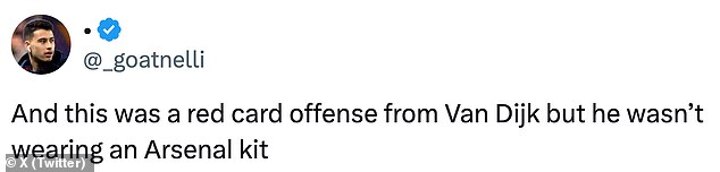 A similar message from a different Gunners supporter moaned: 'And this was a red card offense from Van Dijk but he wasn't wearing an Arsenal kit'.