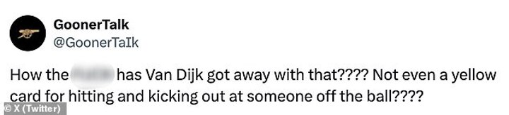 Writing on X (formerly Twitter), one fumed: 'How the F*** has Van Dijk got away with that???? Not even a yellow card for hitting and kicking out at someone off the ball????'