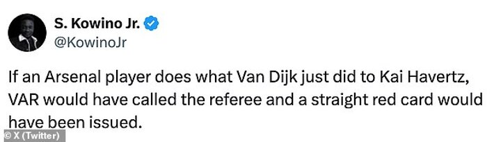 Another tweeted: 'If an Arsenal player does what Van Dijk just did to Kai Havertz, VAR would have called the referee and a straight red card would have been issued.'