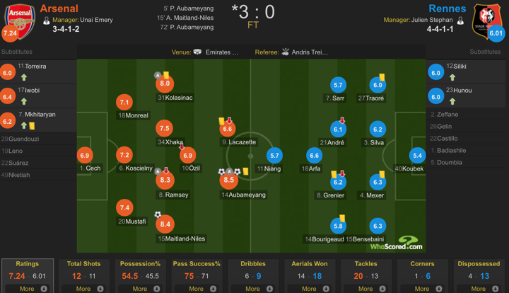 72'GOAL! Arsenal 3-0 Rennes (Aubameyang)