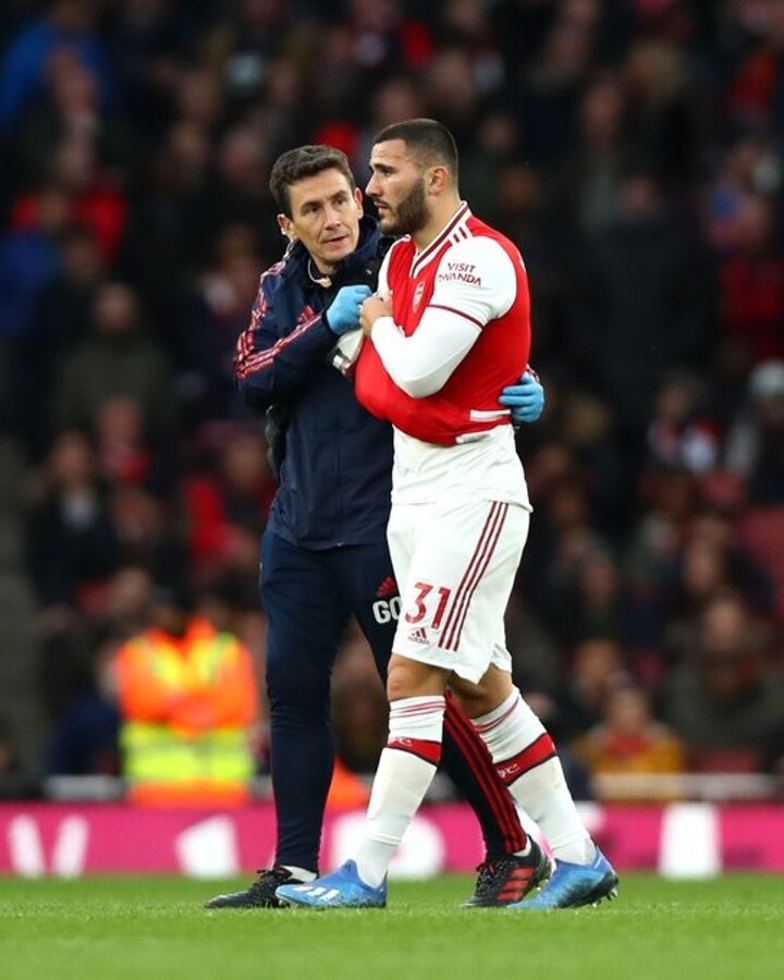 Kolasinac looks rather dazed as he makes his way off to be replaced by Bukayo Saka.