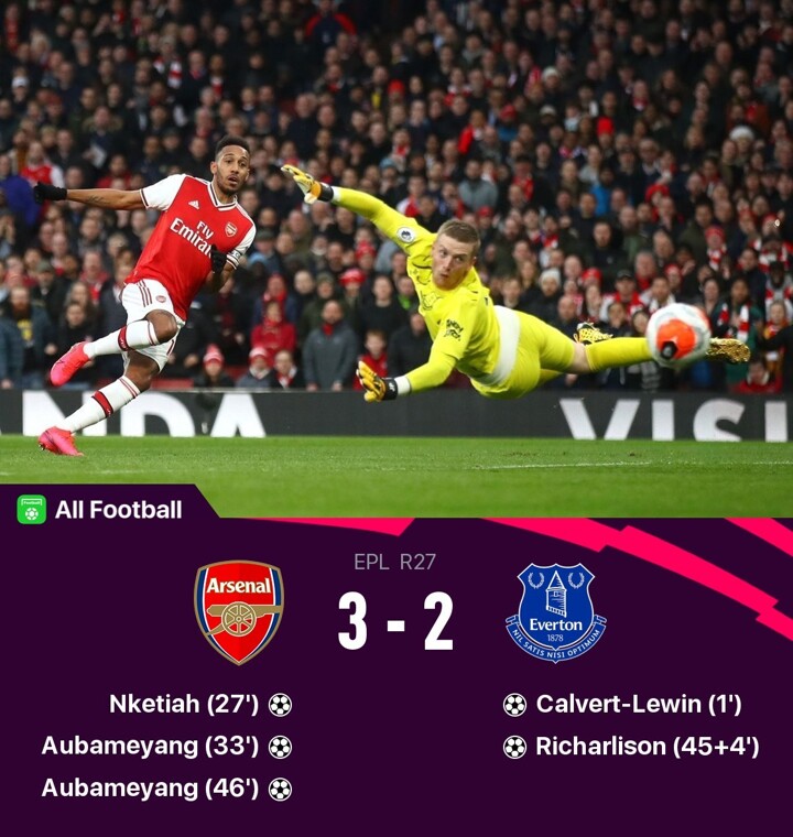 Aubameyang springs the offside trap to latch onto a delightful through ball from Luiz. He then has the composure to bend his shot into the far corner and beyond the despairing dive of Pickford.