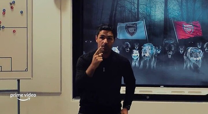 However, after the downbeat start, Arteta is then filmed giving a rallying cry to his squad, with a picture showing a pack of wolves and the Arsenal flag on the screen.
