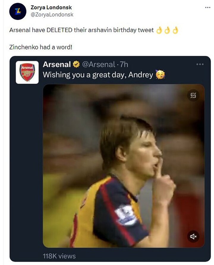 Another asked how Oleksandr Zinchenko, the Ukraine international who currently plays for Arsenal, would feel about their birthday post for Arshavin.
