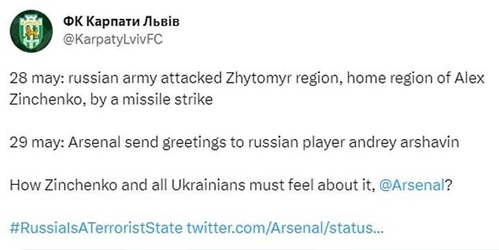 @KarpatyLvivFC put: '28 may: russian army attacked Zhytomyr region, home region of Alex Zinchenko, by a missile strike 29 may: Arsenal send greetings to russian player andrey arshavin How Zinchenko and all Ukrainians must feel about it, @Arsenal?'