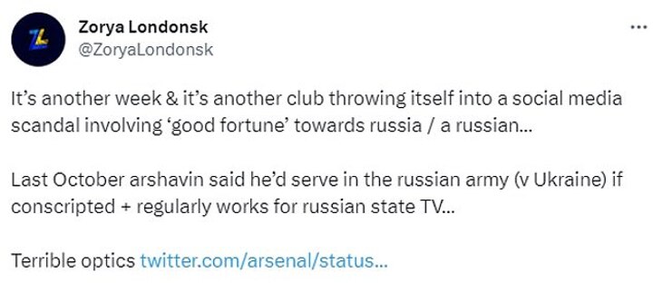 Ukrainian football account @ZoryaLondonsk wrote: 'It’s another week & it’s another club throwing itself into a social media scandal involving ‘good fortune’ towards russia / a russian…