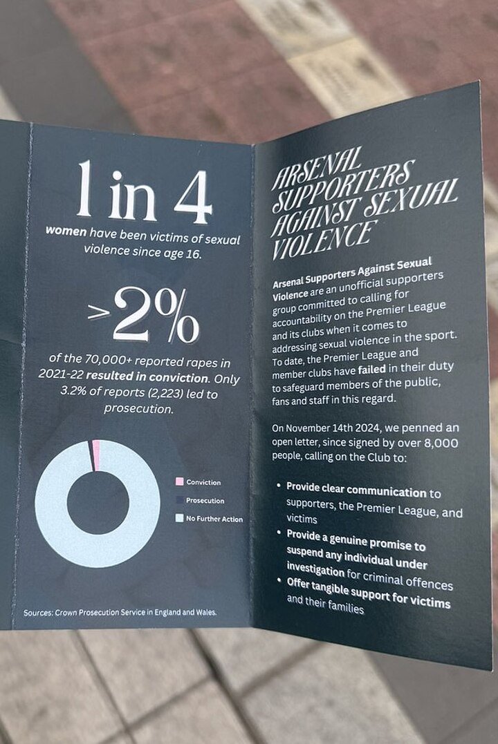 One page read: 'Arsenal Supporters Against Sexual Violence are an unofficial supporters group committed to calling for accountability on the Premier League and its clubs when it comes to addressing sexual violence in the sport.