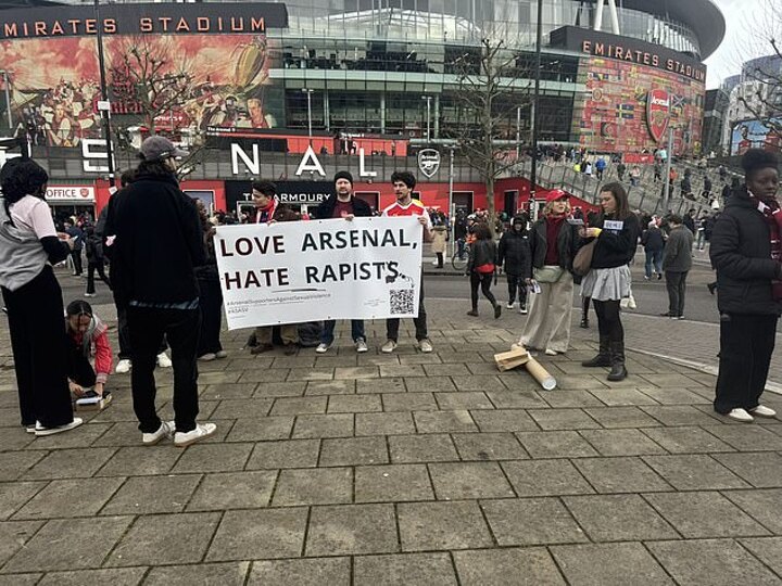 The Arsenal Supporters Against Sexual Violence were seen holding a sign which read: 'Love Arsenal, Hate Rapists' outside the Emirates.