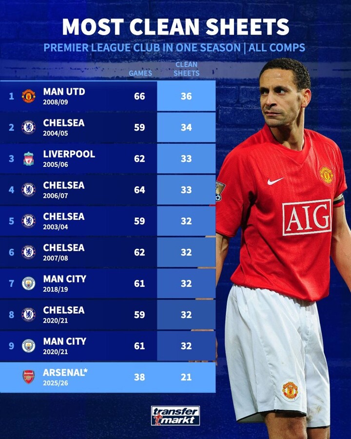 In season 2025/26, Arsenal has kept 21 clean sheets so far across all competitions. Will they catch up with the clean sheets record Manchester United achieved in 2008/09 with 36 clean sheets in 66 games?