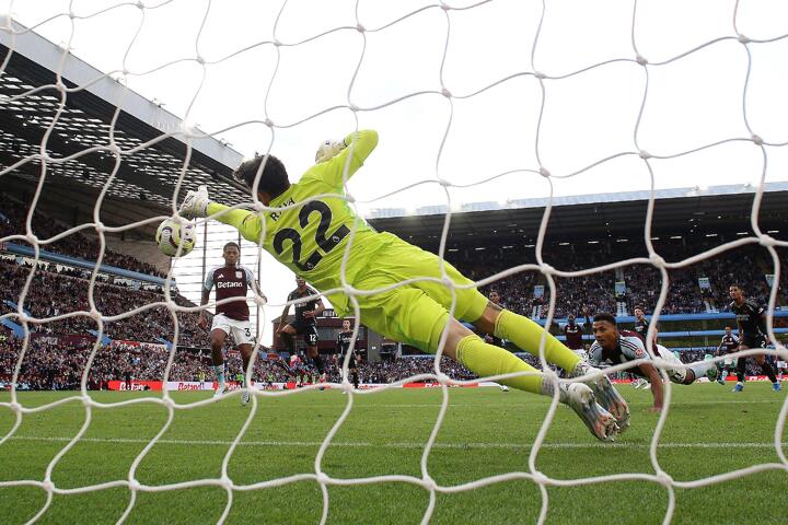 He then pulled off an unbelievable stop on the line to deny a Watkins header, getting up off the floor after a deflected shot smacked the bar and bounced out.