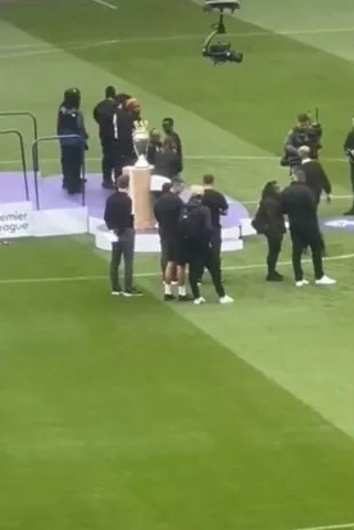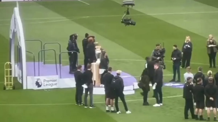 A video shared on social media has shown club staff taking to the winners' podium alongside the plinth with the trophy on top. It appears that they also collected fake medals - just as the players would if the North London side were named champions.