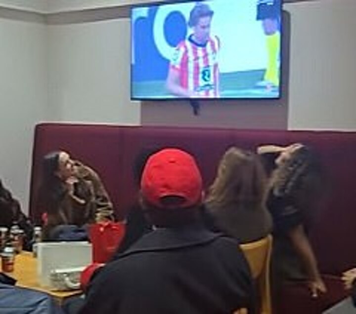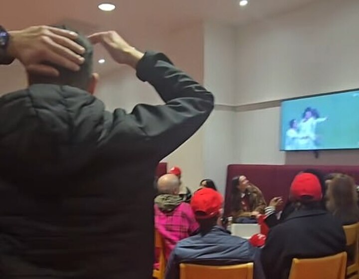 The video begins with the packed room having just seen Marcos Llorente miss Atletico's fourth penalty of the shootout.