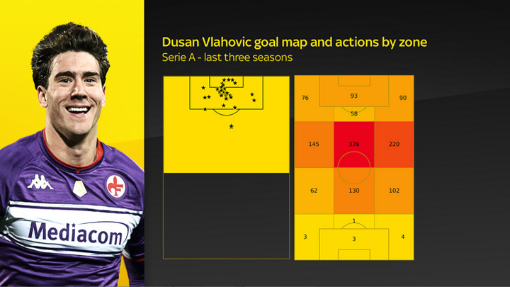 Vlahovic's athleticism means he is well-suited to playing on the counter-attack as well as fulfilling the role of a target man - his actions by zone map shows his tendency to drop deep in search of possession - but those who know him best consider his mental qualities to be most crucial.