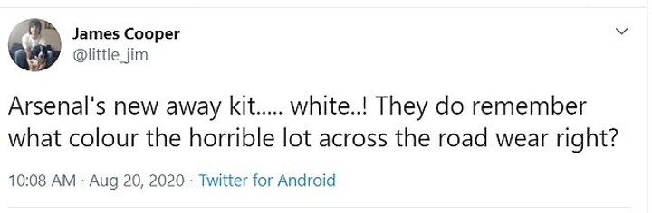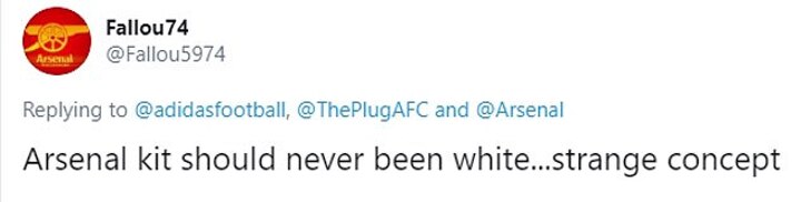 'Arsenal kit should never been white... strange concept,' wrote one fan. 'Arsenal's new away kit..... white..! They do remember what colour the horrible lot across the road wear right?' tweeted another.