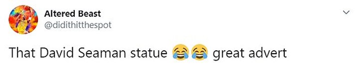 Seaman was clearly a source of amusement as another fan posted on social media: 'That David Seaman statue. Great advert,' accompanied with crying laughing emojis.