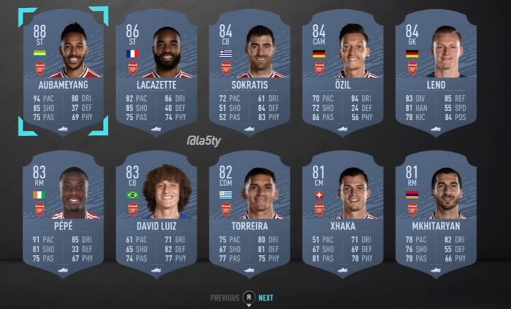 Here are Arsenal's player ratings in FIFA 20. Aubameyang is top of the list with a score of 88 out of a possible 99. Lacazette has been given 86 points, and Ozil 84 pts.