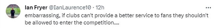 A further fan also hit out at the treatment as they said: 'Embarrassing, if clubs can't provide a better service to fans they shouldn't be allowed to enter the competition....'