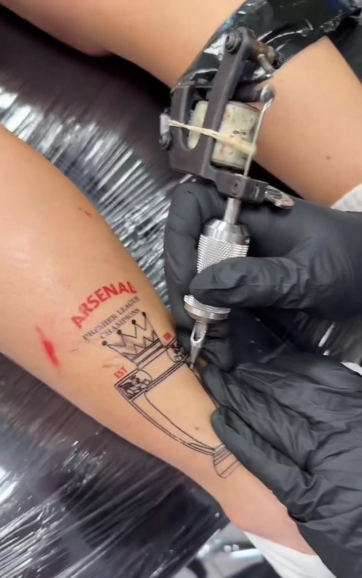 A video shared by Astrid on social media showed Leah laying down in a tattoo parlour as she was tatted with a Premier League trophy that read: "Arsenal - Premier League champions".
