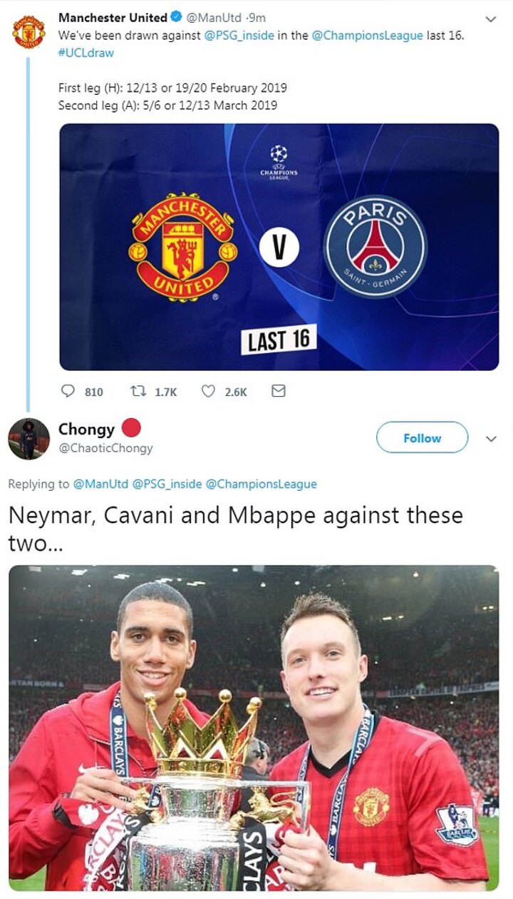 United confirmed the fixture on their official Twitter page, to which one fan immediately responded with an image of centre-back pairing Chris Smalling and Phil Jones.