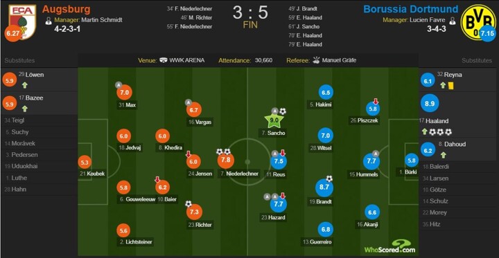 Erling Braut Haaland scored a stunning debut hat-trick off the bench as he led Borussia Dortmund to a remarkable 5-3 victory over FC Augsburg.