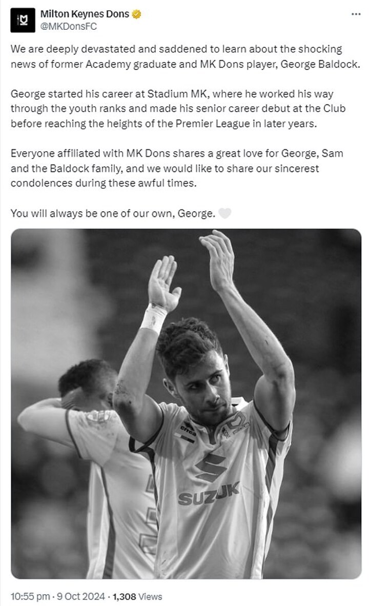 They said: 'We are deeply devastated and saddened to learn about the shocking news of former Academy graduate and MK Dons player, George Baldock.
