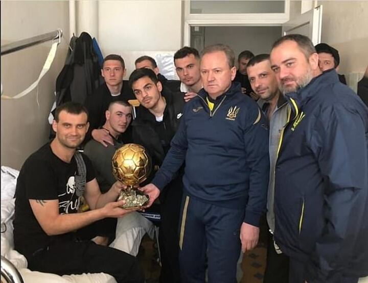 Meanwhile, Belanov also brought his 1986 Ballon d'Or to a hospital in the war-torn city to show it off to some of the injured servicemen receiving treatment there.