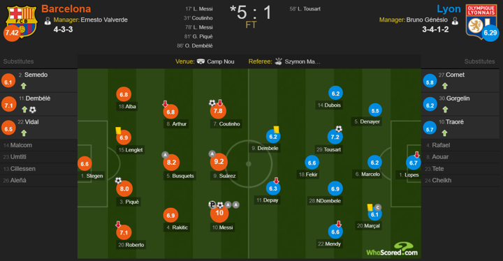 Messi runs at the heart of the Lyon defence before sliding a pass to an unmarked Dembele in the left inside channel. The Frenchman drills his effort low and hard at goal. Gorgelin gets a hand to the ball, but once again he fails to keep it out as it trickles into the bottom corner. The Catalan club have been clinical in the last 10 minutes.