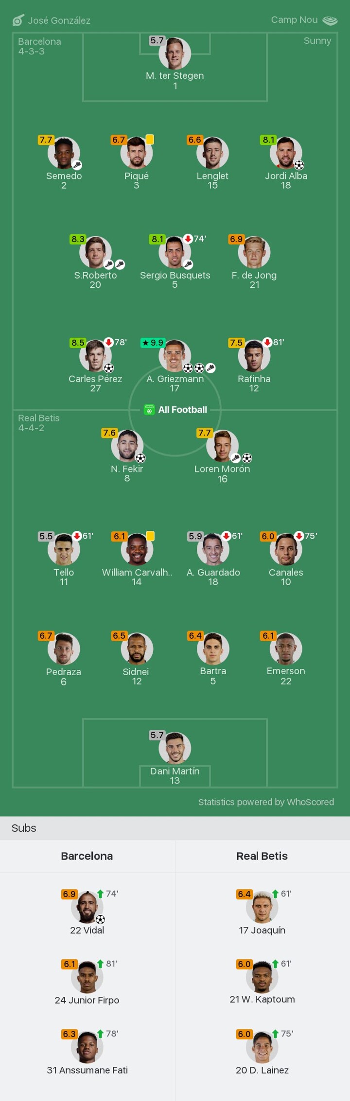 We bring you the player ratings for Barcelona vs Real Betis as A. Griezmann becomes Man of the Match with a rating of 9.9.