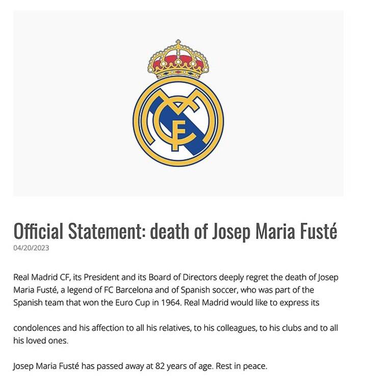Stating: 'Real Madrid CF, its President and its Board of Directors deeply regret the death of Josep Maria Fusté, a legend of FC Barcelona and of Spanish soccer, who was part of the Spanish team that won the Euro Cup in 1964.
