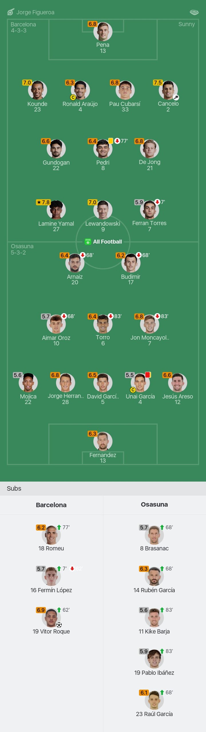 We bring you the player ratings for Barcelona vs Osasuna as Lamine Yamal becomes Man of the Match with a rating of 7.8.