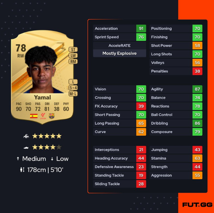 As well as his very respectable FUT rating, they have handed Yamal an acceleration stat of 91 while other high stats include agility [87], dribbling [86] and composure [79].
