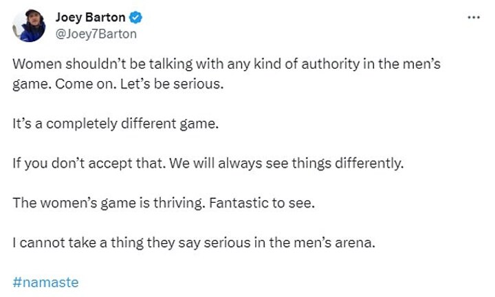 'Sounds like to me that Joey has a problem with particular pundits who haven't done enough in the game, but how does he know? And how do we quantify that? There's EFL players who are commentating, co-commentating on Champions League games. So what level - as far as Joey Barton is concerned - do you have to get before you can be an expert on the 'men's game'?'