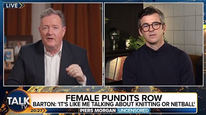 'I don't want to see sexism in football, but if we don't debate (the role of women in football broadcasting) properly, this is just going to rise and rise, and ruin the experience of watching elite-level men's football,' Barton said when asked by Morgan if the language of his social media posts had been deliberately inflammatory.