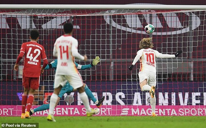 And the thrilling encounter in Bavaria continued after the break as Forsberg somehow found a free header in the box following a fine move involving Nkunku and Angelino to nod Leipzig into the lead once again.