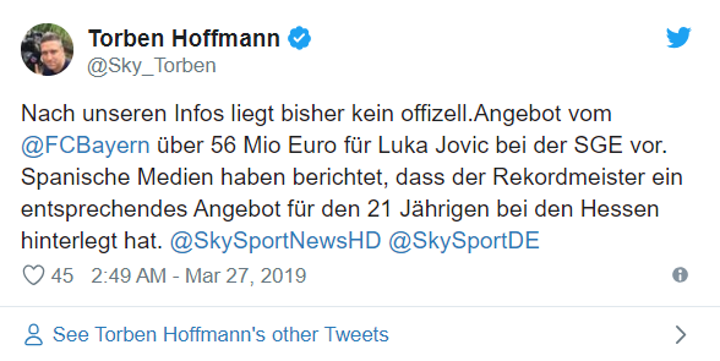 "According to our information, no official offer for over 56 million euros has been made by FC Bayern to SGE [Eintract Frankfurt] for Luka Jovic.